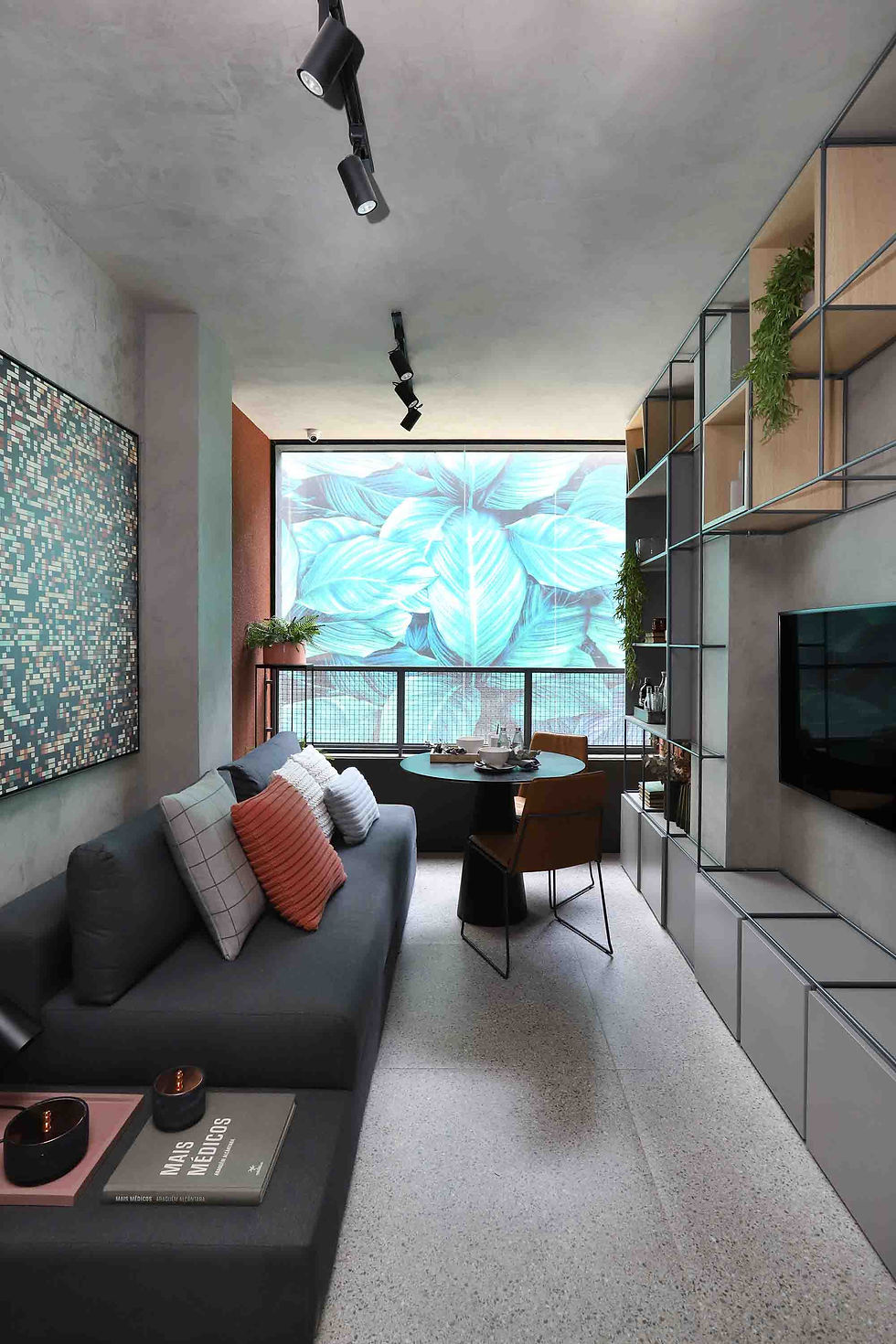 Neste apartamento de 32m² a ideia foi valorizar a circulação na área social diminuindo a quantidade de mobiliário. Para isso, foi criada uma estante de ponta a ponta vazada, que ajuda na praticidade, e também oferece amplitude ao ambiente.