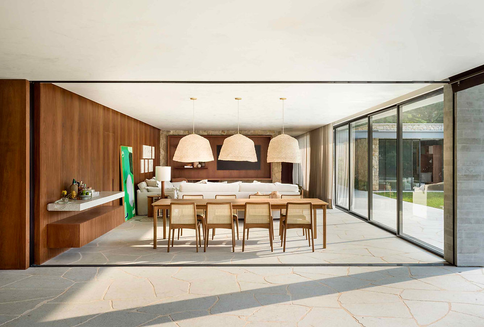 Seja no desenho orgânico do piso ou na brutalidade das paredes, as pedras marcam presença no primeiro pavimento, evocando a beleza rústica e bucólica da vida no interior. A grande protagonista do projeto, no entanto, é a madeira cumaru, presente em toda a marcenaria e entregando ao décor sua beleza elegante, sóbria e atemporal.